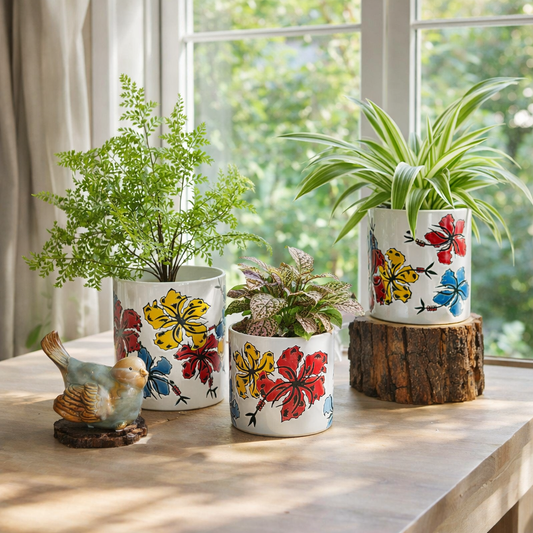 White Floral Ceramic Planter - Set of 3