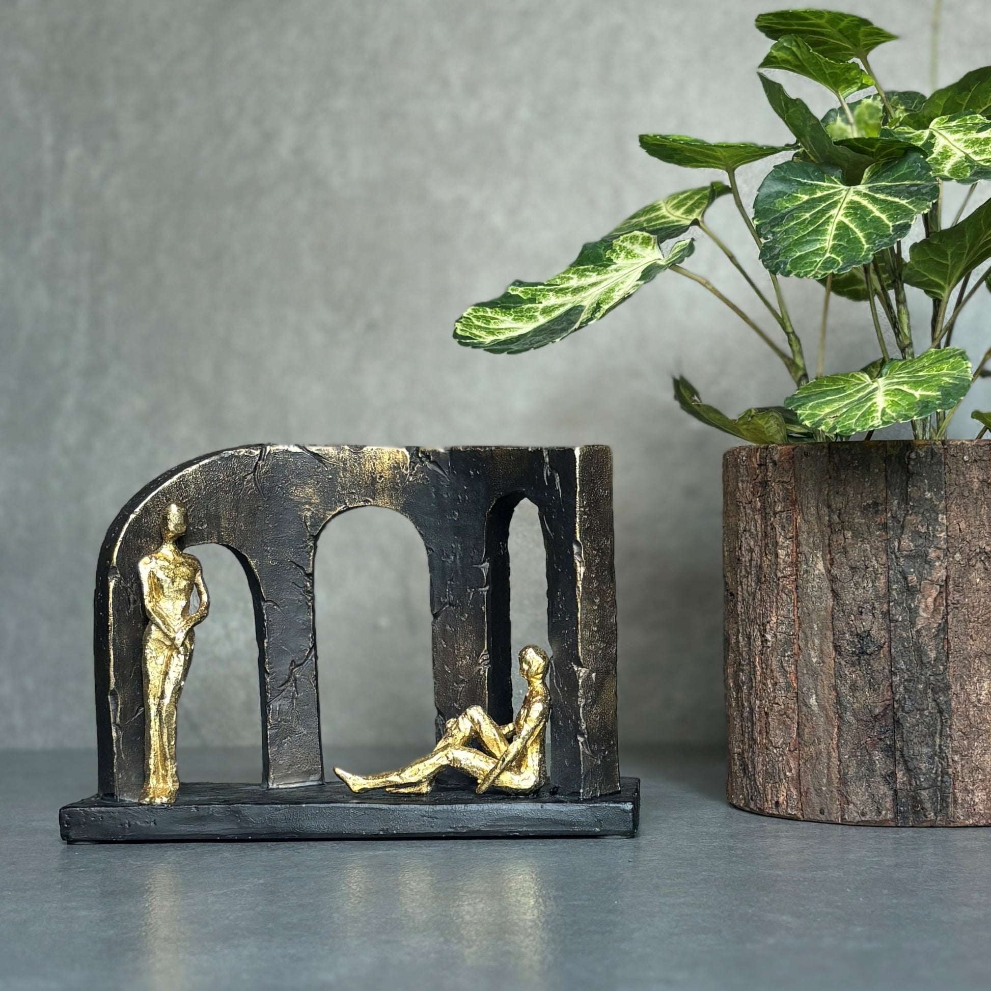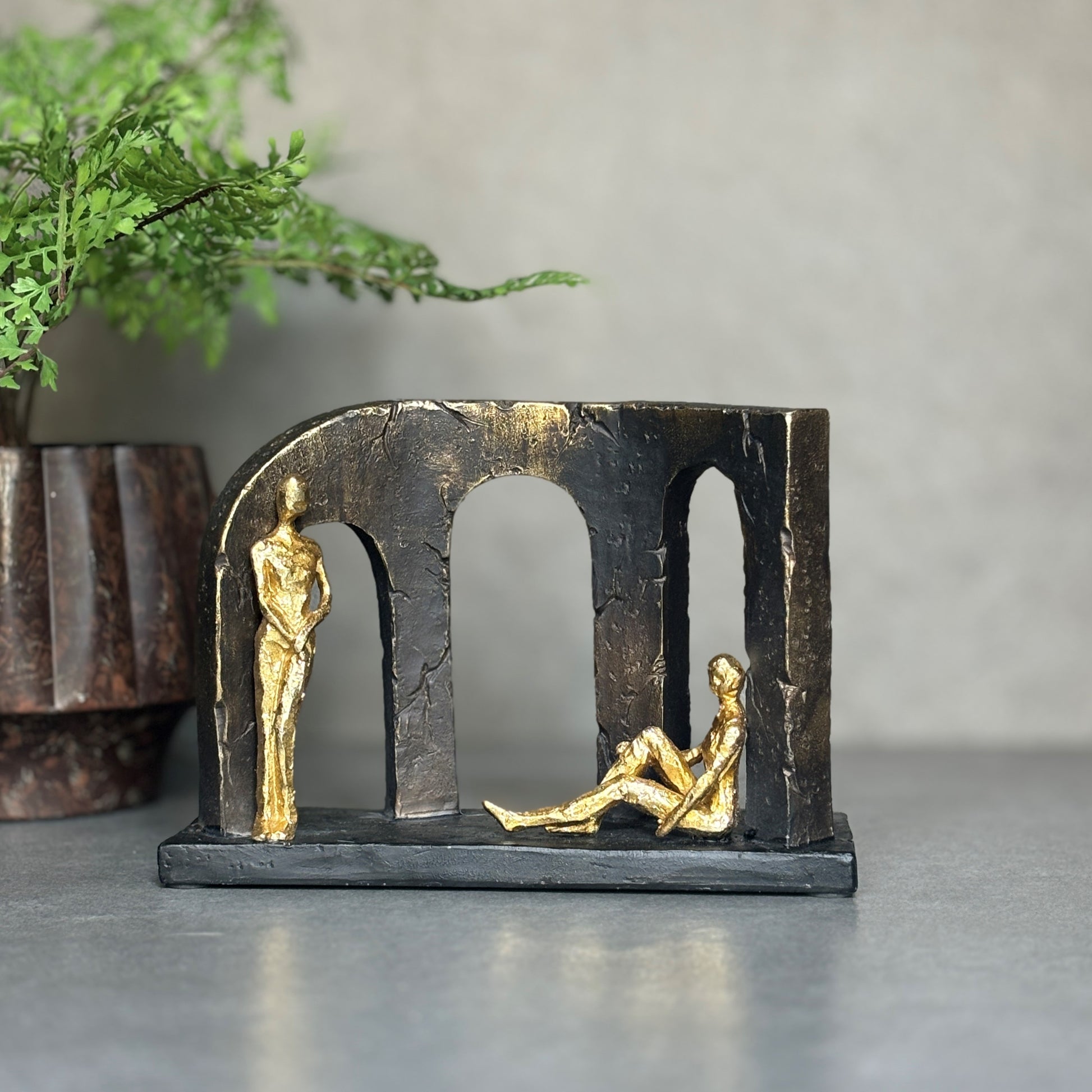 - A classic piece: This exquisite gold statue depicts a couple gracefully seated on a stone arch, symbolizing unity and companionship. The intricate detailing of the figures captures their serene expressions, while the lustrous gold finish adds a touch of elegance. Ideal for enhancing any space.