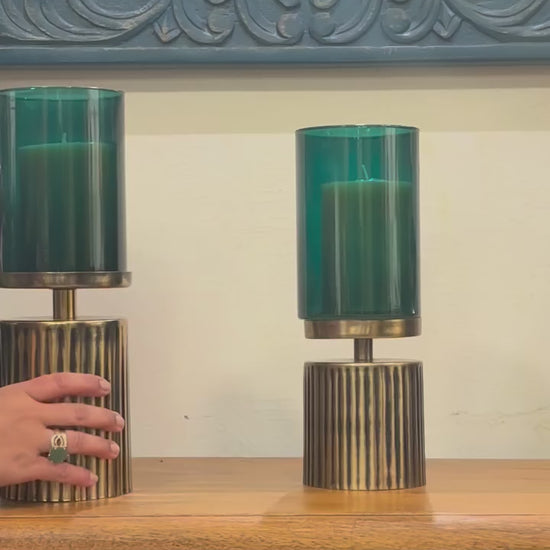 - Festive glow: Enhance your space with a touch of timeless elegance and refined luxury through our ribbed pattern candlestands, meticulously crafted from mild steel. These exquisite pieces are thoughtfully designed to elevate the ambiance of any room, from your inviting living area to your sophisticated dining space. The innovative design introduces a captivating textural element that harmoniously complements the antique gold finish. Brighten your evenings with the gentle glow of flickering candlelight, filtering through colored glass to create an intimate setting for a romantic dinner or a cozy night in.