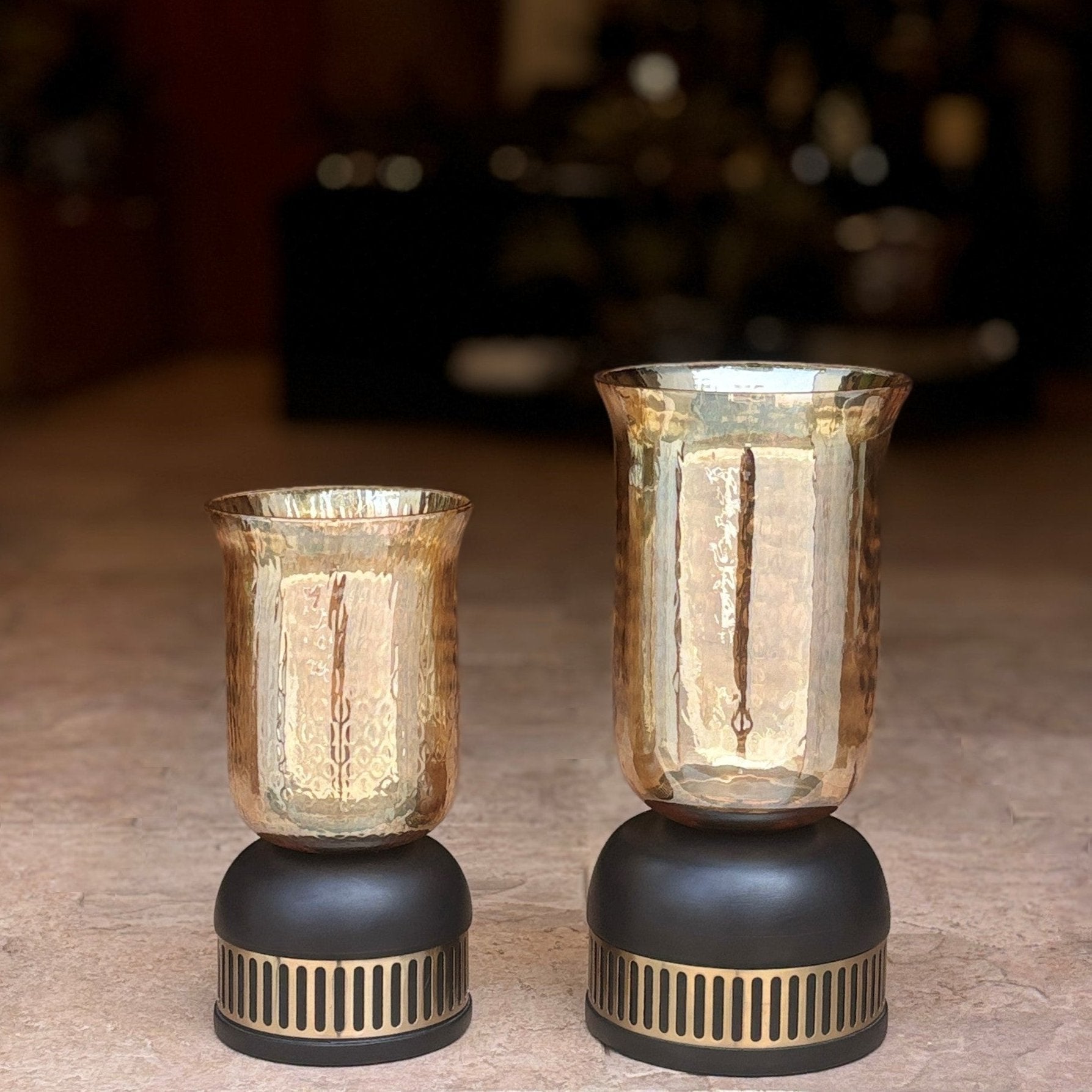 - Elegant and sophisticated: These sophisticated glass candlestands, tastefully arranged atop a sleek oak base, will elevate any room. The glass's elegant design offers a hint of refinement, while the dark brown base contrasts to create a contemporary look. These candlestands are great for both regular use and special events, and they're perfect for creating a cozy atmosphere in any space.