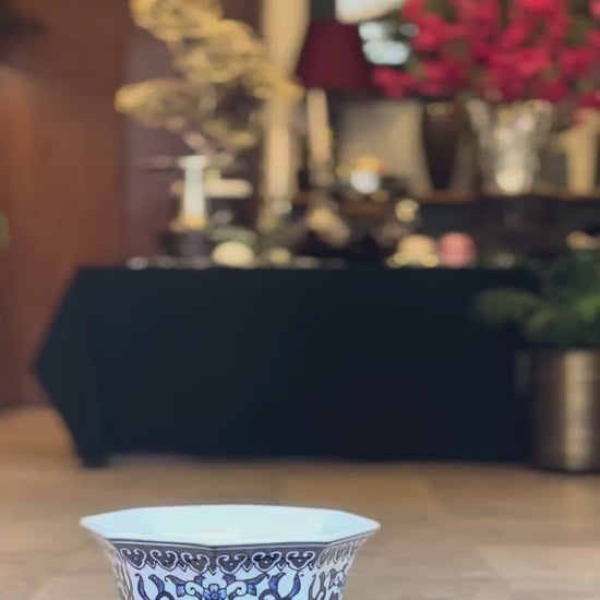 - Refined table adornment: Bring timeless elegance to your space with these adorable Blue and White Porcelain Octagonal Tall Planters. Showcasing classic blue floral detailing, each planter is handcrafted with an octagonal shape that adds a refined architectural touch. The tall profile and footed base make them perfect for creating height and visual interest in your decor. Whether placed indoors or in a covered outdoor setting, they beautifully complement a variety of plants.