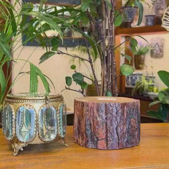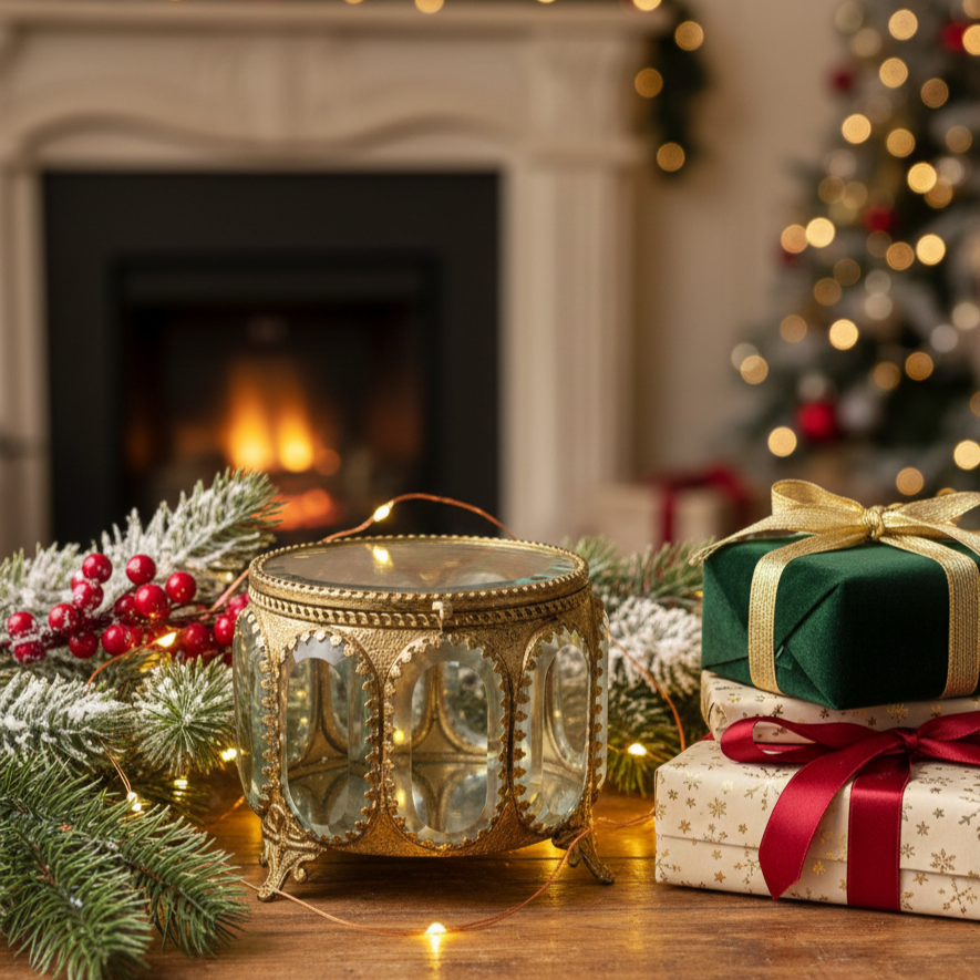 Ornate design inspiration: Inspired by vintage boudoir treasures, this trinket box features beveled magnifying glass panels framed with intricately embossed brass, capturing light beautifully to create a jewel-like presence on any surface.
