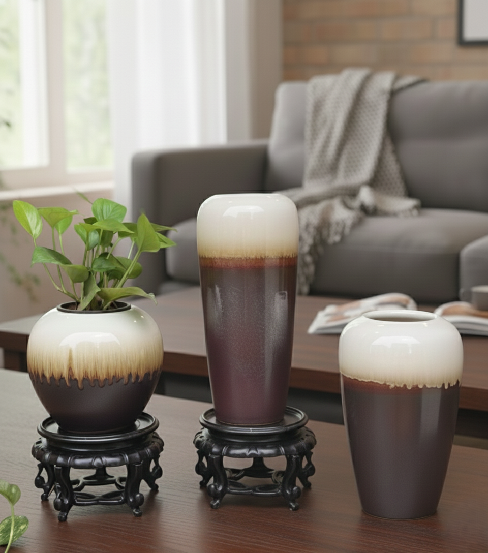 - Simple and classy: Our Ceramic Glazed Brown Vases are crafted with expertise by master craftsmen. With their stunning glazed finish and warm brown hue, they effortlessly complement any decor style. These elegant vases add a touch of sophistication to any tabletop or surface in your home. You can get creative and showcase either real or faux flowers in these uniquely shaped vases. They're perfect for brightening up your living space or sprucing up your office.