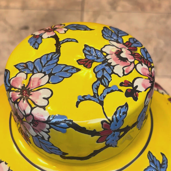 A piece that commands attention: Hand-painted with pastel blossoms and soft blue leaves dancing across a marigold yellow base, this piece captures the freshness of blooming branches in motion. A charming butterfly motif adds the perfect touch of playfulness against its tall, sleek silhouette.
