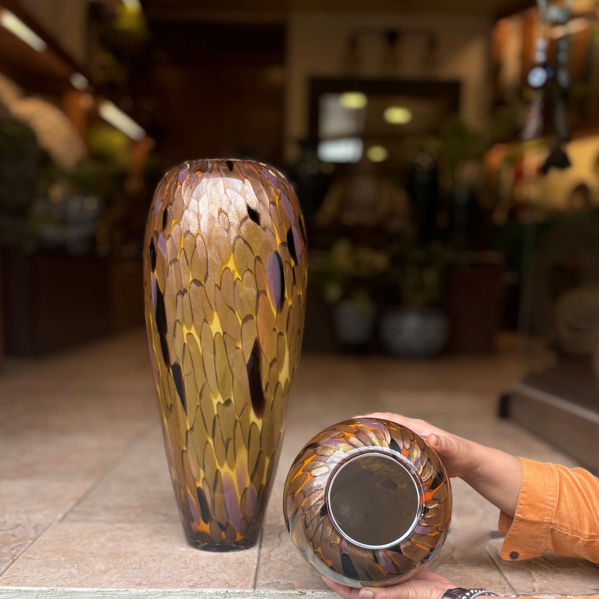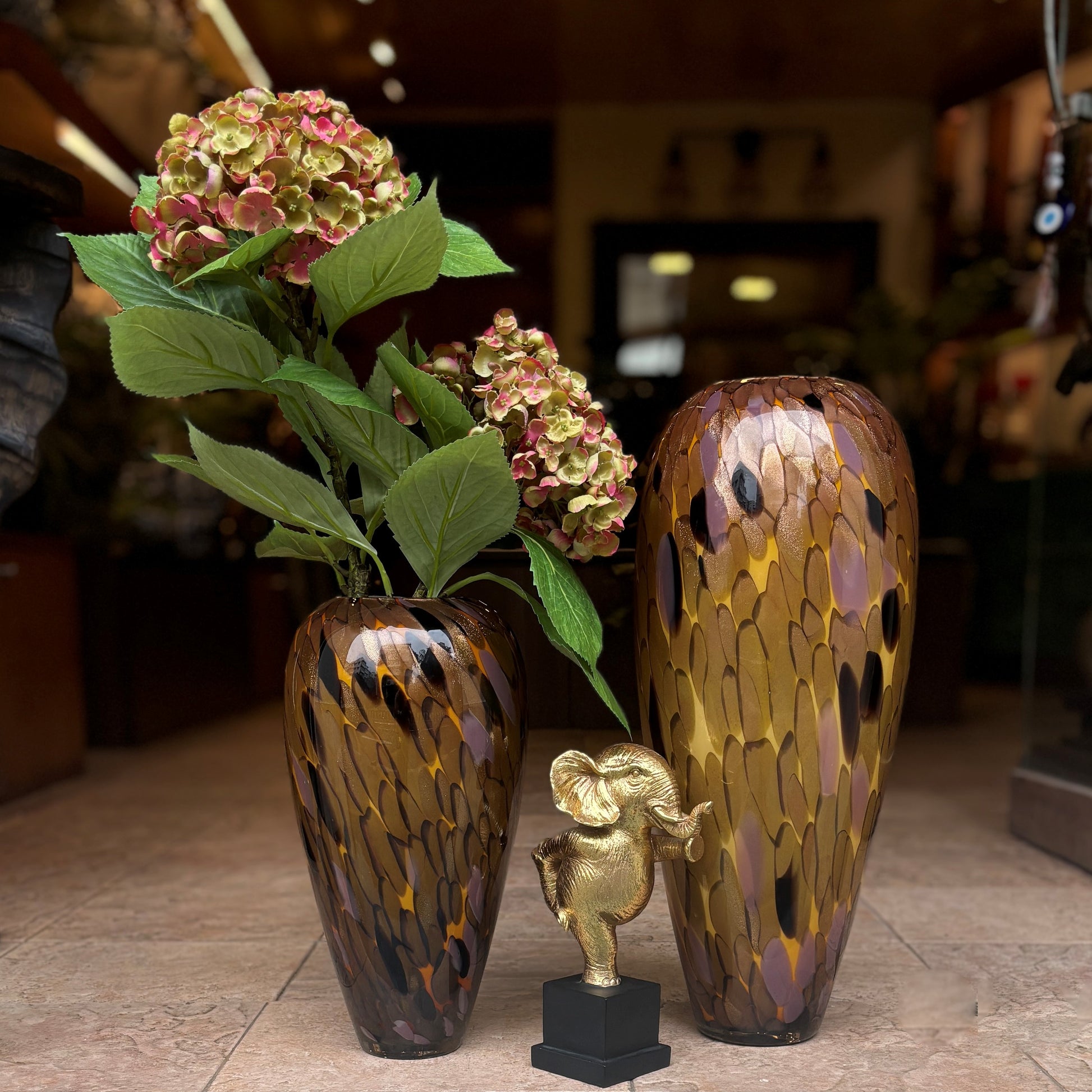 - Simple And Classy: This Amber Handblown Glass Vase has a calm expression and goes lovely with a simple twig. It exudes a captivating aura, elevating any room with its mesmerizing design. The refined contours make it a perfect adornment for modern and classical spaces. Exuding timeless elegance and sophistication, this masterpiece is a testament to the unparalleled craftsmanship of its creators. Embrace the allure of this captivating vase and enhance the ambiance of your home with its enchanting presence.