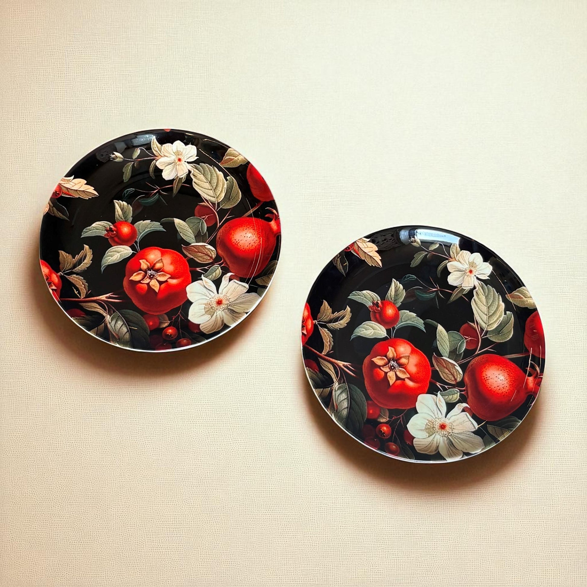 - Fruitful elegance: Bold and eye-catching, this ceramic wall plate features bright red pomegranates, delicate white flowers, and lush green leaves on a deep black background. The vivid red fruits create a striking contrast, adding a lively and elegant touch to any space.