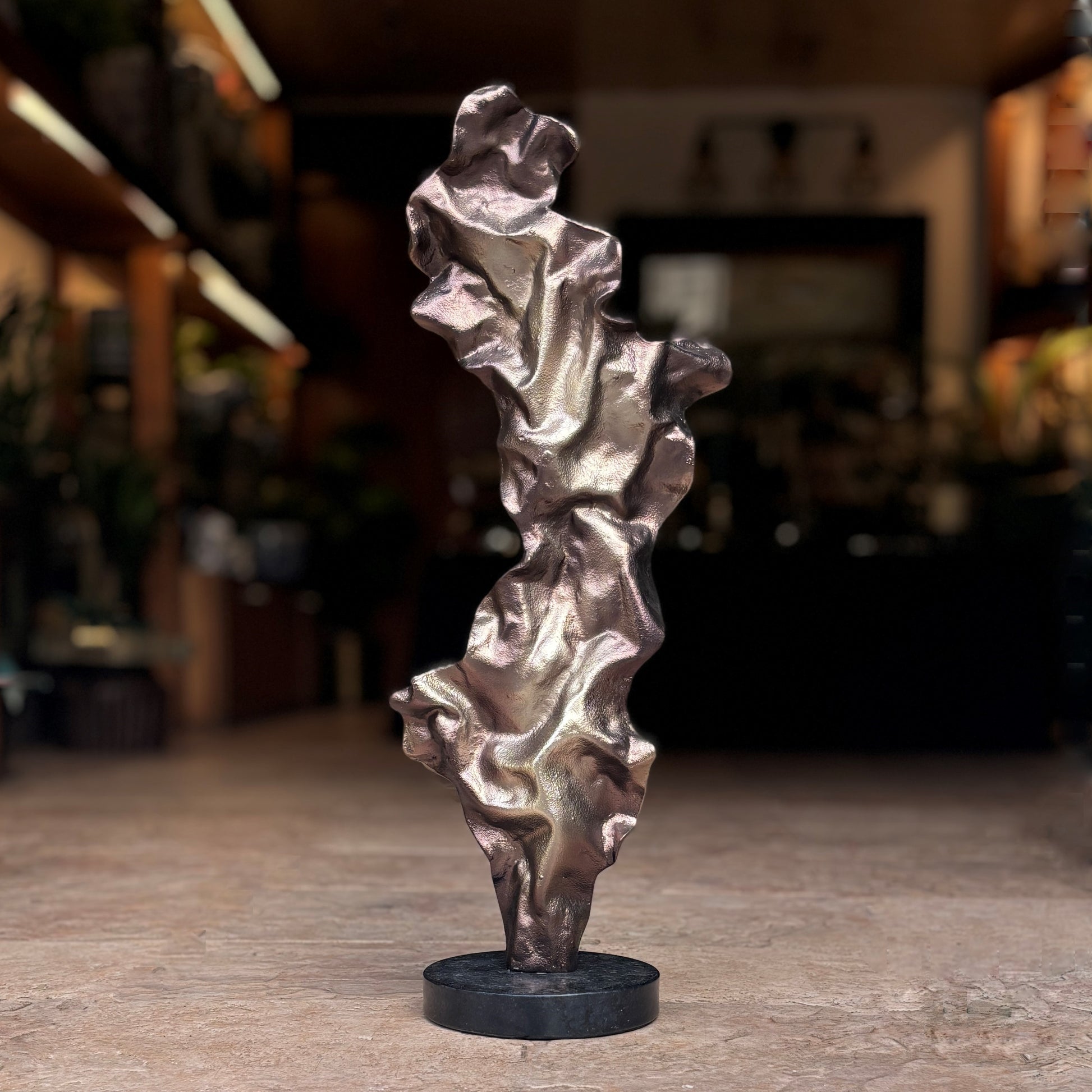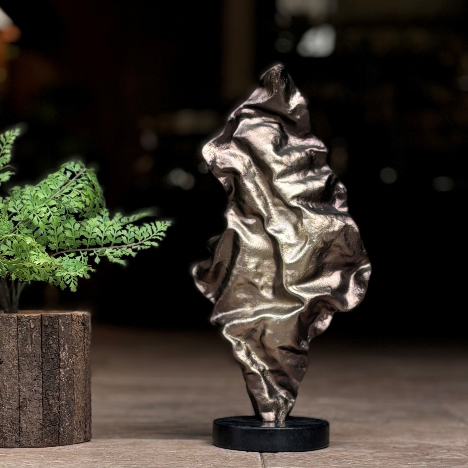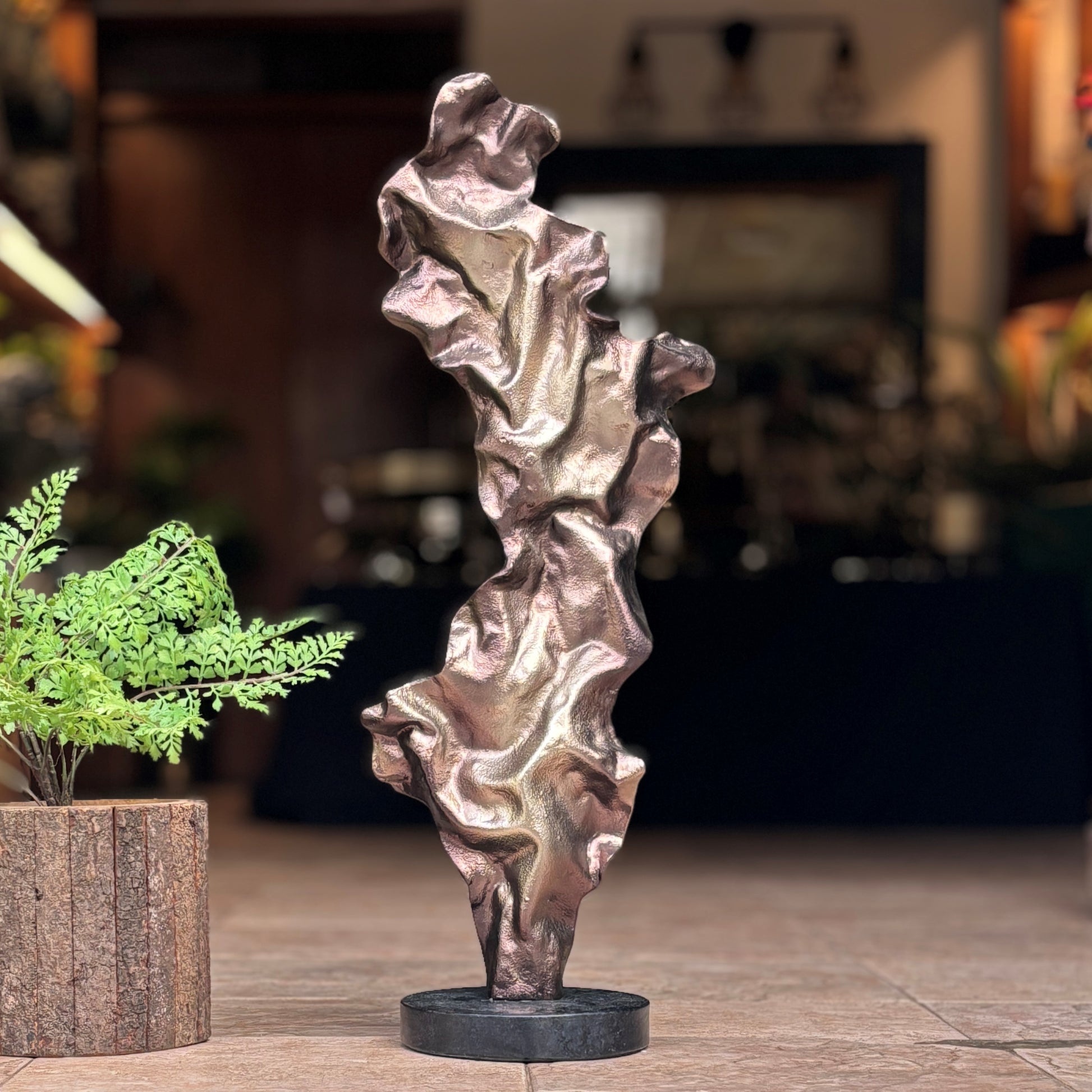 - Modern accent: The rumpled sculpture is a stunning piece of art handcrafted from premium quality, aluminium. This rumpled design exudes elegance and comes in two sizes, making it a versatile addition to your console or side table. Its gorgeous bronze tone contrasts nicely with a sleek black base, creating a striking visual effect that captures attention. Whether used as a statement piece or a subtle accent, the sculpture adds a touch of artistry to any space, making it an ideal choice for both modern and classic interiors.