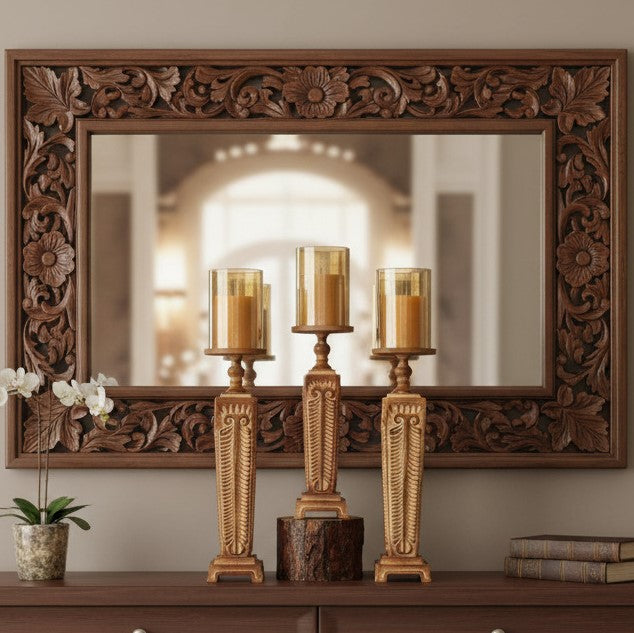 - Unique finish: This rustic candle stand, featuring tinted glass, enchants with its intricate detailing. Meticulously crafted from premium aluminum with a glazed ceramic finish, it highlights the rich, natural warmth of wood tones. With its textured surface and vintage-inspired design, this piece exudes timeless charm, making it an elegant decorative accent for any space.